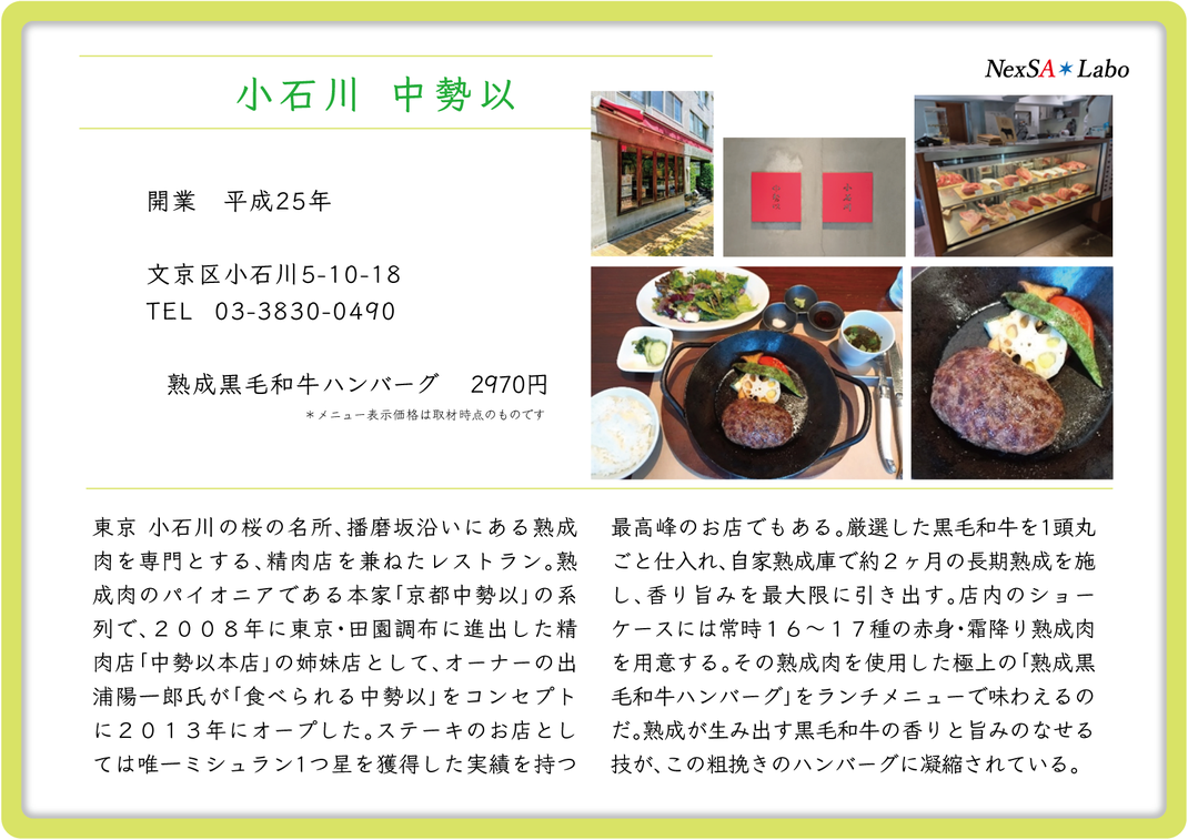和牛専門の精肉卸売業のヤザワミートが直営する、カジュアルな雰囲気のステーキ・ハンバーグ店。精肉卸売業ならではの厳選した "A5ランク黒毛和牛" に拘るお店として人気を集める。
