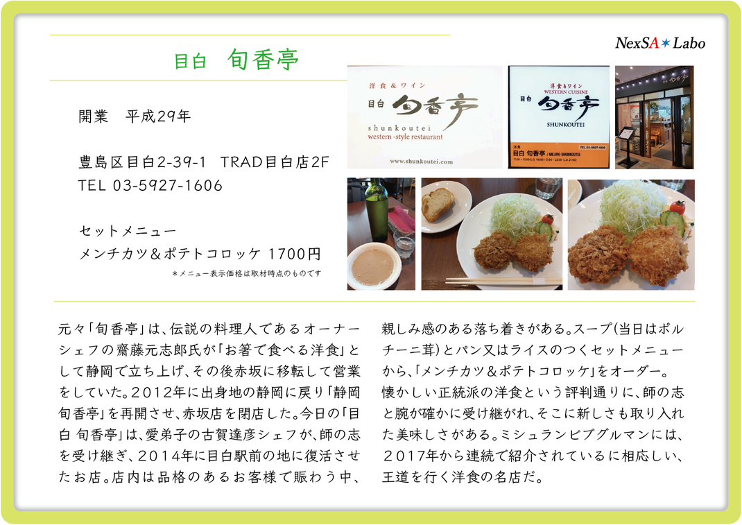 元々赤坂にあった「旬香亭」を愛弟子の古賀達彦シェフが師の志を受け継いで、2014年に目白駅前に復活させたお店。懐かしい正統派の洋食に新しさも取り入れる。ミシュランビブグルマンには2017年から連続で紹介される洋食の名店だ!