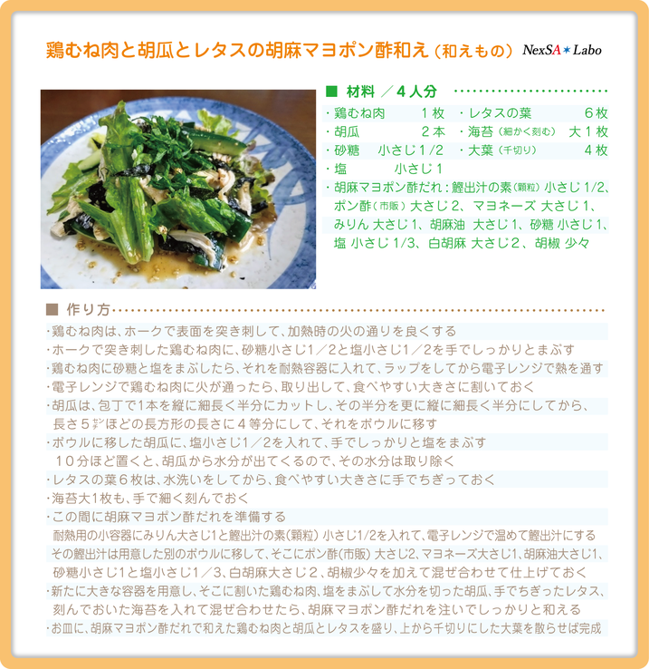 さっぱりとした鶏むね肉とシャキシャキした胡瓜とレタスの食感が、刻み海苔の風味と共に胡麻マヨポン酢のたれと絶妙にマッチ。この爽やかな味わいは、暑い夏場にピッタリの和えものです!