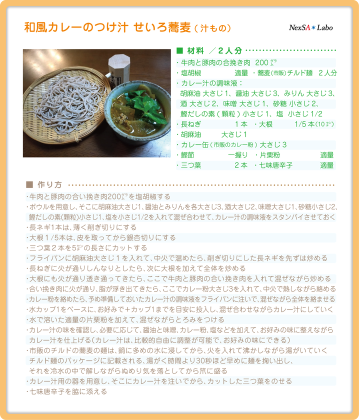 ご自宅では、一般的に「ざる蕎麦」を献立にしないので、お蕎麦やさんに出向きます。この特製のカレーのつけ汁を用意すれば、お蕎麦屋さんに負けない、食欲をそそる家族全員が喜ぶ一品に。暑い夏場におすすめです。