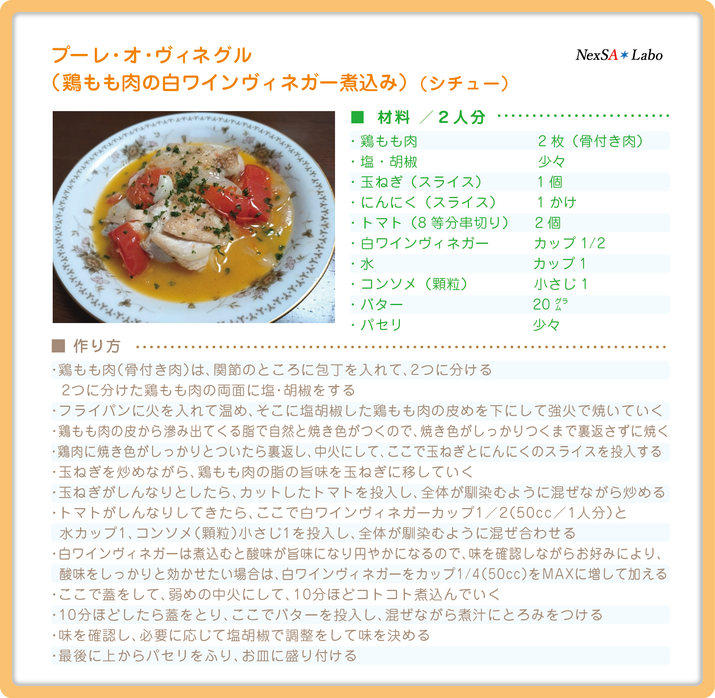 鶏もも肉の旨味、トマトの旨味と甘みと酸味、白ワインヴィネガーのパンチ力のある酸味が、三位一体となり融合することで、芳醇で円やかな異次元の旨味と酸味を醸し出す、フランスリヨン地方を代表する素朴な郷土料理です。