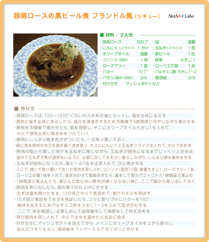 焼いた豚肩ロース肉を黒ビールで煮込んだ、フランス北部からベルギーのフランドル地方にかけての郷土料理です。豚肩ロース肉の旨味に玉ねぎの甘味が、バルサミコ酢の風味と黒ビールの仄かな苦味と心地よく溶け込んだ逸品です!